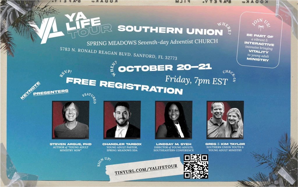 The Southern Union Young Adult LIFE Tour will be held at the Spring Meadows Seventh-day Adventist Church, 5783 N Ronald Reagan Blvd, Sanford, FL 32773, October 20-21, 2023, with the Friday registration check in beginning at 7:00PM [Eastern]. Free registration at tinyurl.com/YALIFEtour